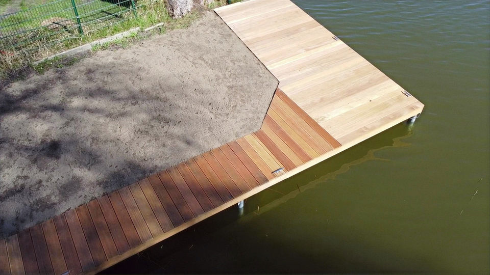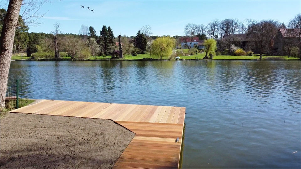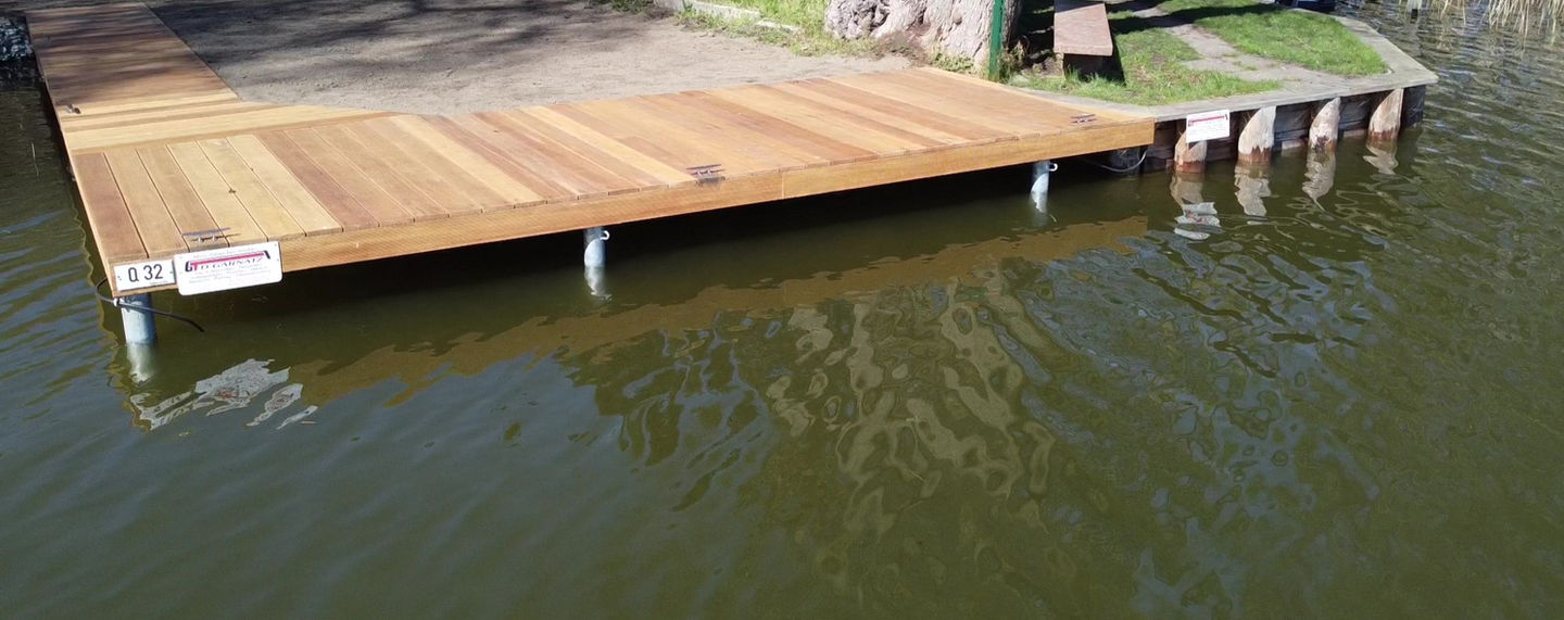 Alle Steganlagen bestehen aus einer sehr massiven Stahlunterkonstruktion mit aufgesetzter Holzunterkonstruktion aus Eiche und geriffeltem, 5cm starkem Eichenbelag.