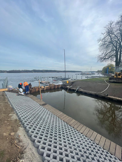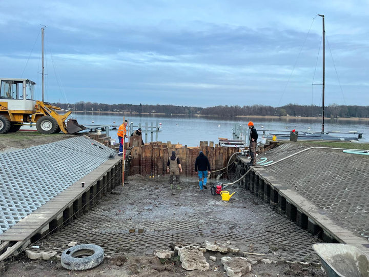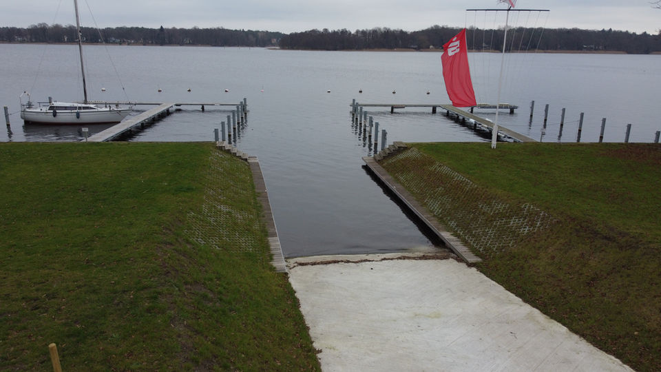 Die beschädigte Fahrbahn aus Rasengittersteinen wurde vollständig entfernt und durch eine robuste Betonfläche ersetzt. Im Zuge der Arbeiten wurden zudem die Böschung, die Stege sowie die Treppen rund um die Slipanlage neu angelegt.
