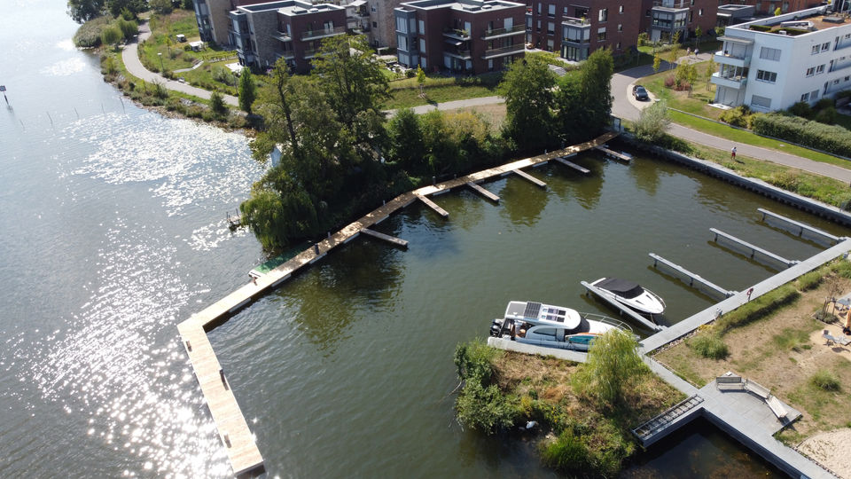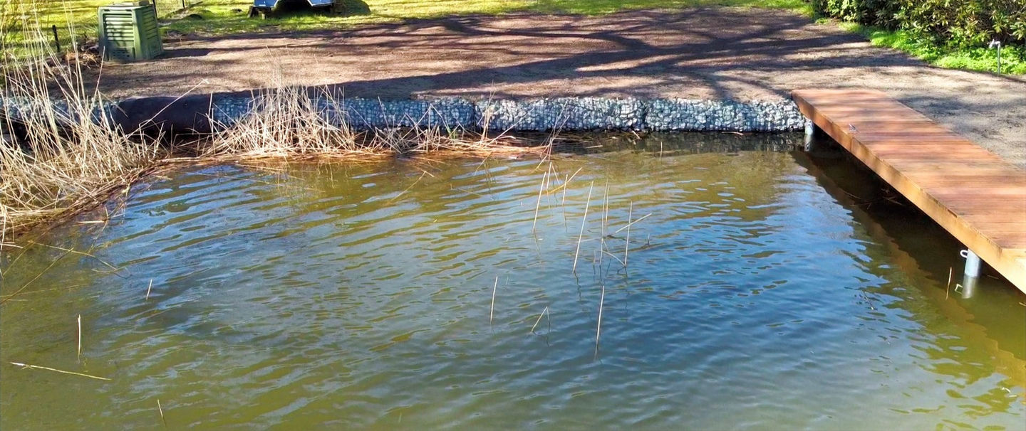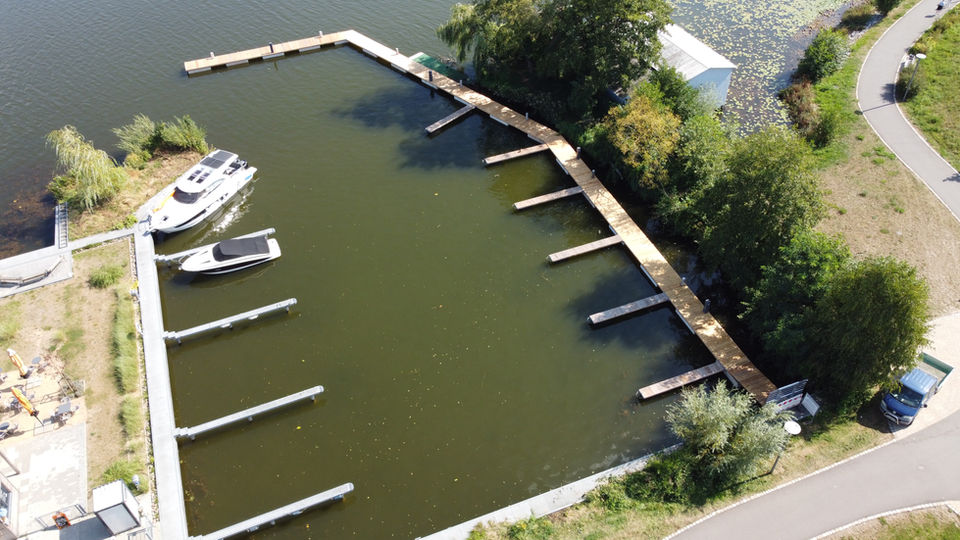 Ecksteganlage mit Bangkiraibelag, Bootsklampen sowie Metallösen an den Stegpfählen. Die massive Unterkonstruktion ist aus verzinktem Stahl geschweißt. Darunter befindet sich die langlebige Uferbefestigung aus Steinwalzen.